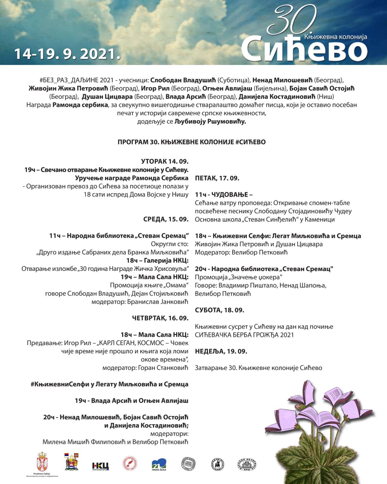 U programu Kolonije 2021. posebno mesto zauzimaju sadržaji kao što su okrugli sto, koji je ovaj put posvećen Sabranim delima Branka Miljkovića, dodela književne nagrade “Ramonda serbika” i internog priznanja kolonije “Mikina čaša”, književni portreti učesnika, otkrivanje spomen-table pesniku Slobodanu Stojadinoviću Čudeu, kao i drugi programi u Sićevu, Nišu i u Niškoj Banji, najavljeno je iz Niškog kulturnog centra.