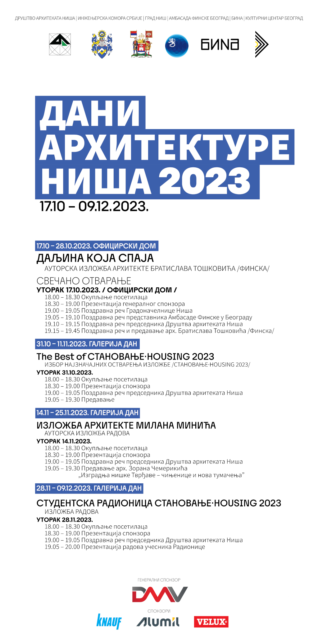 „Daljina koja spaja“ je naslov izložbe i predavanja arhitekte iz Finske, Bratislava Toškovića i njome će otpočeti realizacija programa manifestacije. Kroz dve nedelje, program će se preseliti u galeriju Društva arhitekata Niša gde će se, u šest nedelja, publici prikazati tri izložbe: The Best of STANOVANjE-HOUSING 2023, Izložba arhitekte Milana Minića i Izložba radova studentske radionice STANOVANjE-HOUSING 2023. Niški arhitekta, Zoran Čemerikić, održaće predavanje na temu „Izgradnja niške Tvrđave – činjenice i nova tumačenja“, najavili su organizatori.