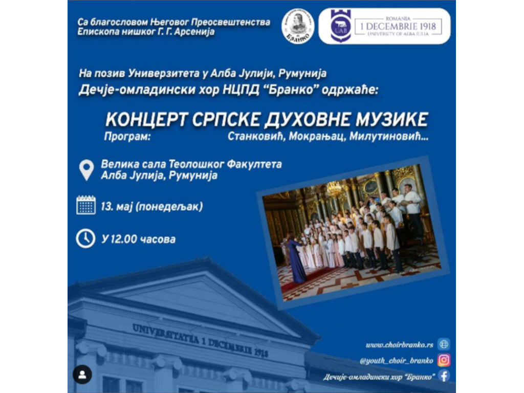 Sa blagoslovom Njegovog Preosveštenstva Episkopa niškog Arsenija, hor će na poziv Univerziteta u Alba Juliji u ponedeljak, 13. maja, održati koncert u Velikoj sali Teološkog fakulteta sa početkom u 12 časova.