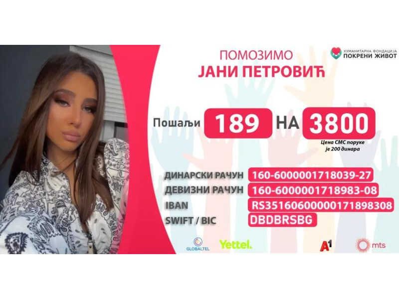 Jana Petrović je rođena 16.12.2006. godine u Nišu. Dete je iz uredno vođene trudnoće. Odmah po rođenju, istog dana je poslata na Univerzitetsku dečiju kliniku u Beogradu. Jani je tada uspostavljena dijagnoza Tetralogija Fallot. Prva operacija je urađena sa godinu i 3 meseca u Tiršovoj. Druga operacija urađena je 2011. godine zbog pogoršanja njenog zdravstvenog stanja. Hirurška intervencija je rađena u inostranstvu kada je tokom hospitalizacije nakon mesec dana urađena i operacija kritične subglostične stenoze traheje. Između operacija je urađeno i nekoliko katetarizacija, ali je Jani sada potrebna naša pomoć kako bi otišla na treću operaciju u inostranstvu.