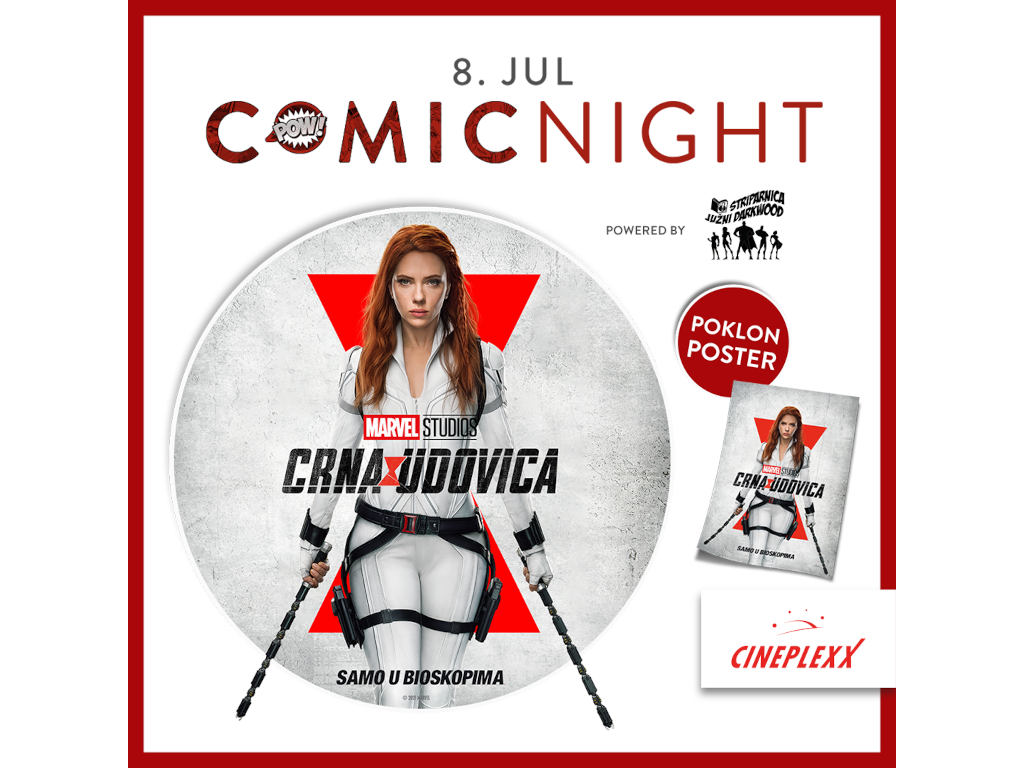 Prvi film četvrte etape Marvelovog filmskog univerzuma donosi Skarlet Johanson kao Natašu Romanov u filmu ,,Crna udovica“. Comic night događaj zakazan je za četvrtak 8. jul od 20 časova u Cineplexx Niš bioskopu.