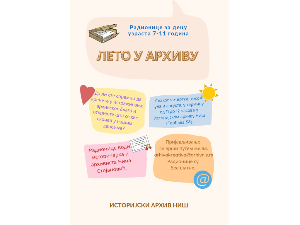Radionice su predviđene za decu uzrasta od 7 do 11 godina, vodiće ih dipl. istoričarka i arhivista Nina Stojanović, a održavaće se svakog četvrtka, tokom jula i avgusta, u terminu od 11 do 12 časova u Istorijskim arhivu (Tvrđava bb). Prijavljivanje dece se obavlja putem mejla: arhivakreativa@arhivnis.rs, a radionice su besplatne.