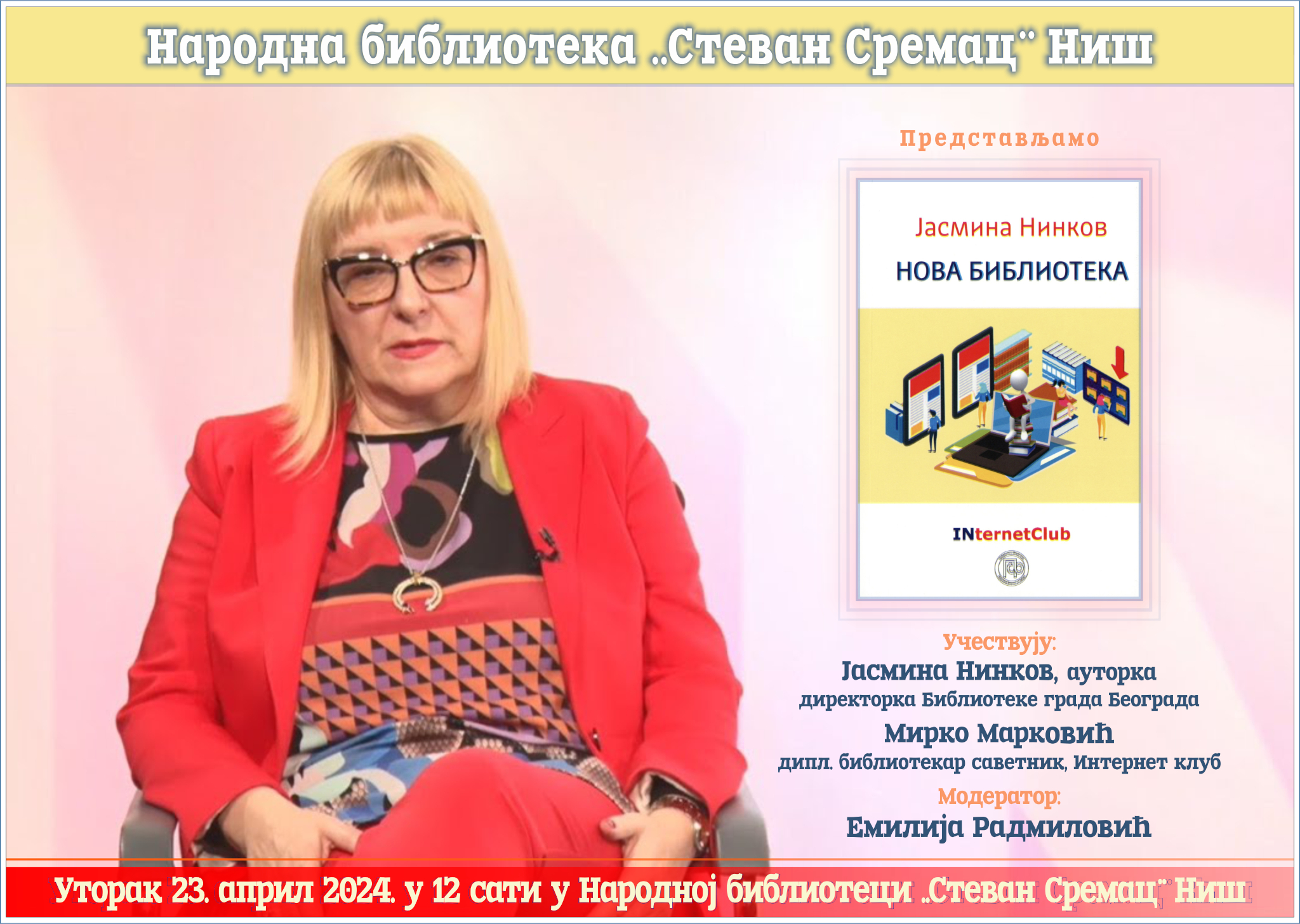 Autorka Jasmina Ninkov, diplomirani politikolog i diplomirani bibliotekar savetnik, direktorka je Biblioteke grada Beograda, najveće javne biblioteke u Srbiji. O knjizi će u ime izdavača (Internet klub Ljig i Pedagoški fakultet Sombor) govoriti diplomirani bibliotekar savetnik Mirko Marković. Moderator: Emilija Radmilović, najavljeno je iz Narodne biblioteke „Stevan Sremac".