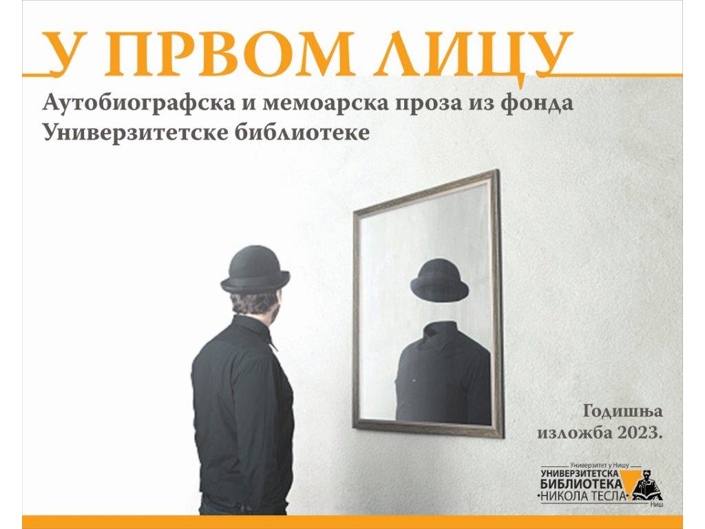 Četvrtak, 18. maj u 12 sati, svečano otvaranje izložbe knjiga „U prvom licu“ u holu Univerzitetske biblioteke. Izložba obuhvata izbor autobiografske i memoarske proze iz fonda biblioteke. Na otvaranju će govoriti upravnica biblioteke Snežana Bojović, doc. dr Mirjana Bojanić Ćirković sa Filozofskog fakulteta u Nišu i gradska većnica za kulturu Adrijana Anastasov.