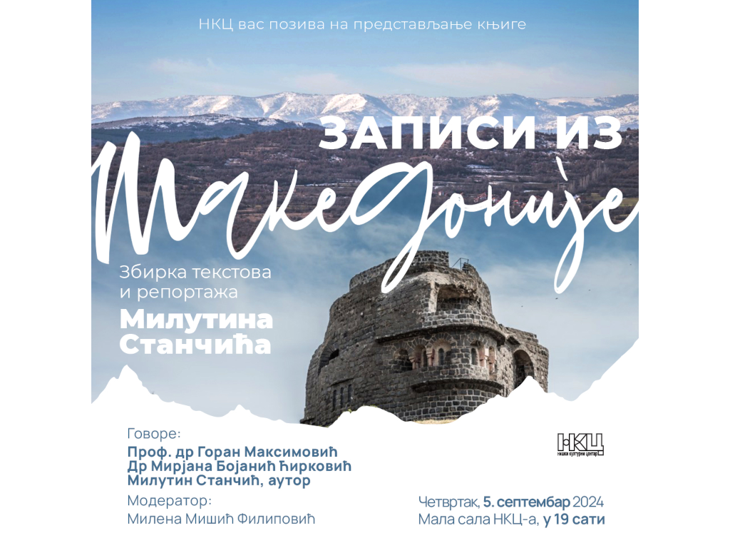 Knjiga "Zapisi iz Makedonije" predstavlja zbirku putopisnih tekstova i reportaža o tragovima viševekovne srpske istorije i kulture na prostoru današnje Severne Makedonije, koje je autor sačinio koristeći brojne istoriografske izvore, kao i etnografske i geografske studije o ovom podneblju, poručuju iz NKC-a.