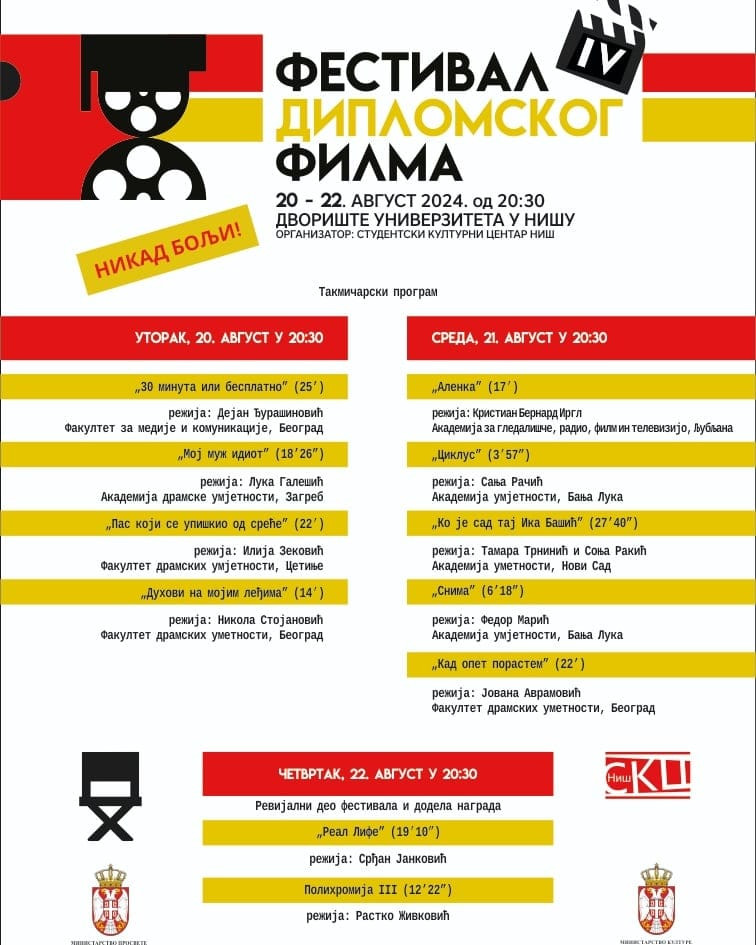 Kao prateći program IV Festivala diplomskog filma, koji je otvoren sinoć, SKC Niš danas (u sredu) u 12 sati organizuje tribinu "Film u visokom obrazovanju - na akademijama i drugim fakuletima".