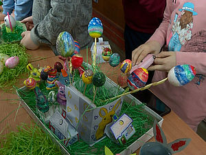 U holu osnovne škole Sveti Sava u Nišu organizovan je uskršnji bazar na kome su deca prodavala i kupovala jaja i ukrase koje su sami napravili.