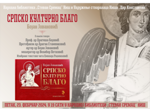 U petak, 23. februara 2024. godine, sa početkom u 19 sati, u Narodnoj biblioteci „Stevan Sremac" Niš biće predstavljena knjiga „Srpsko kulturno blago"...